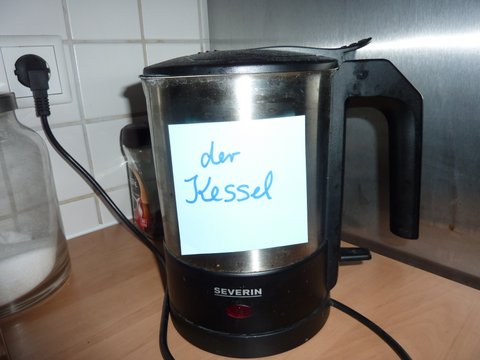 Everytime you go past the item, read ALOUD: Das Regal, der Kessel, die Lampe....
